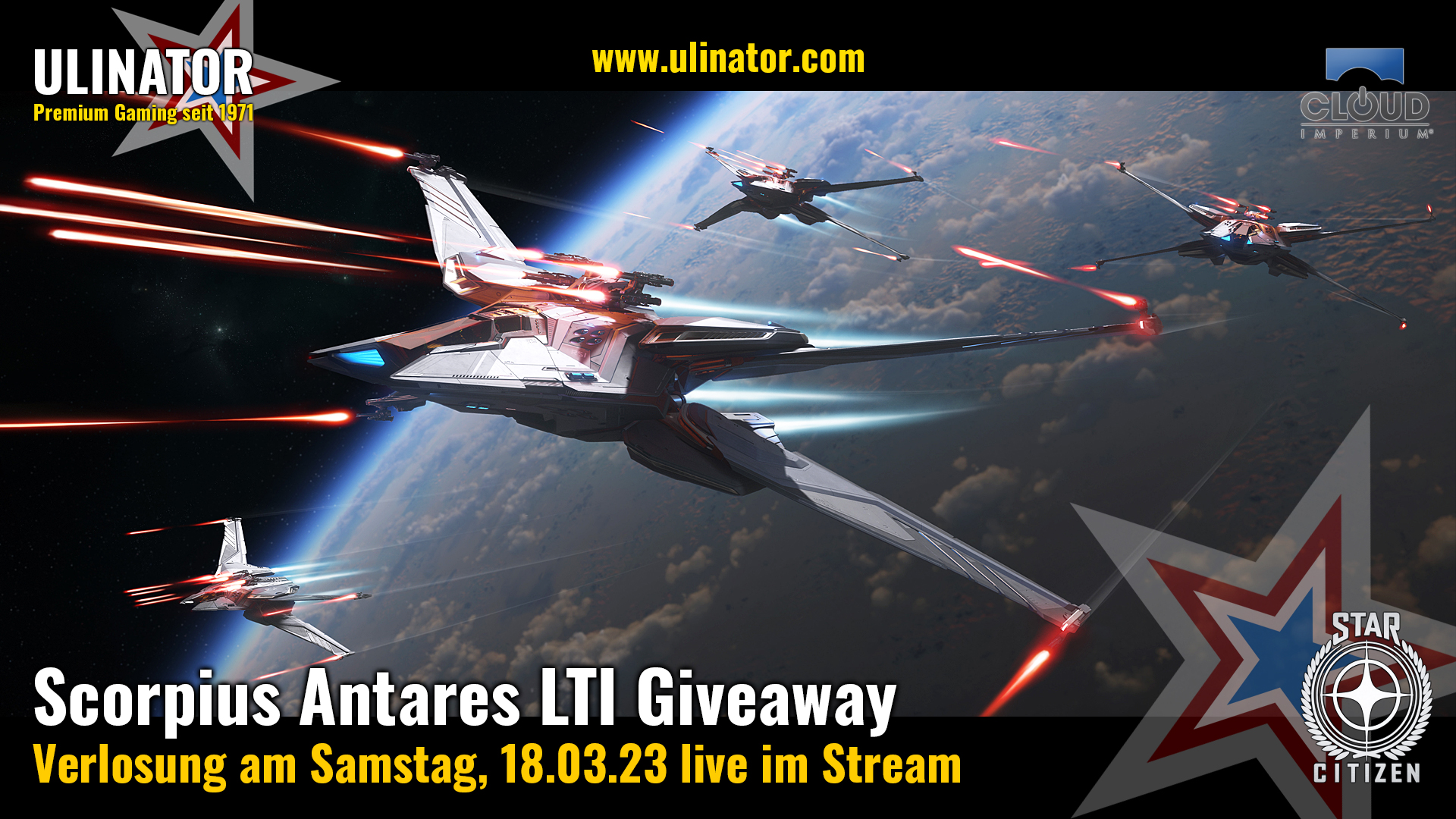 Am Samstagabend, dem 18.03.2023 ab 22:30 Uhr, gibt es wieder etwas zu gewinnen - eine Scorpius Antares inkl. Starterpack und LTI, sponsored by CIG. Jeder kann mitmachen, also kommt vorbei!